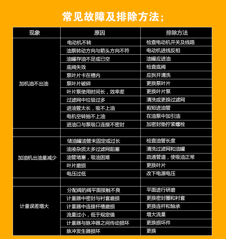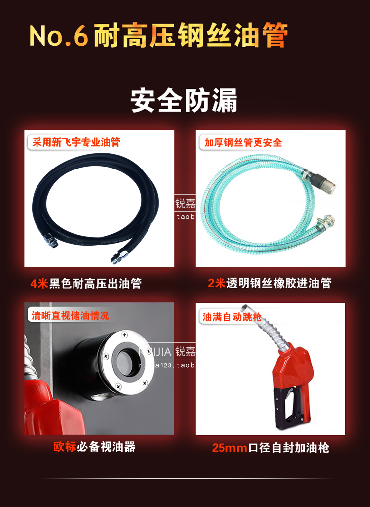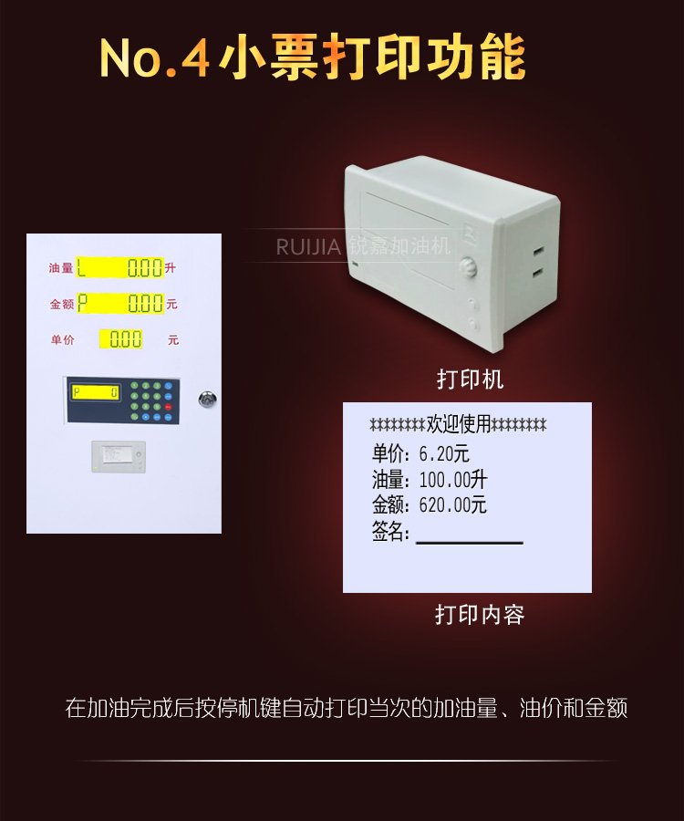 | 標(biāo)準(zhǔn)配置: | 進(jìn)油管2米(透明鋼絲管),出油管6米(黑色橡膠鋼絲管),油管長度可定做,鑰匙一把,加油槍一把(油滿自動跳槍)標(biāo)配主機(jī)(內(nèi)含鋁合金渦輪流量計)。 注意:打印機(jī)和遙控不再標(biāo)配范圍內(nèi),如需要另行購買。 打印機(jī)購買價格:300元 遙控器購買價格:150元 |